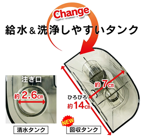 回収タンクは、開口部が14×7cmと大きくなったので、水が捨てやすくなり、洗う時も手を入れて隅々まで洗うことが出来ます♪