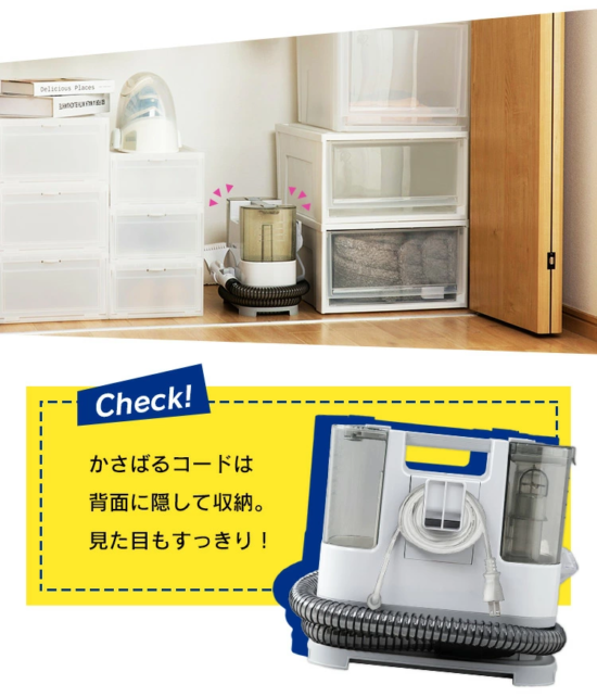 またホースは本体に巻き付けて収納出来るし、コードも本体の後ろ側にまとめられるようになっているので、見た目もスッキリします。